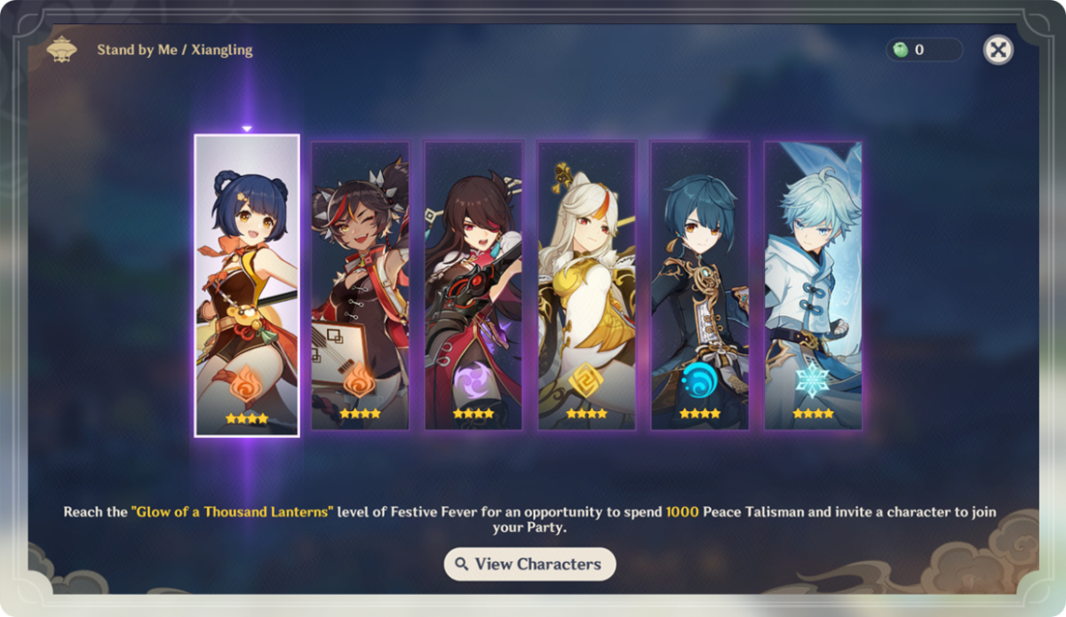 Una volta che la Festive Fever ha raggiunto il livello “Glow of a Thousand Lanterns”, i Viaggiatori possono usare 1.000 Peace Talismans in “Stand by Me” per invitare uno dei personaggi a 4 stelle di Liyue a unirsi al tuo Party.