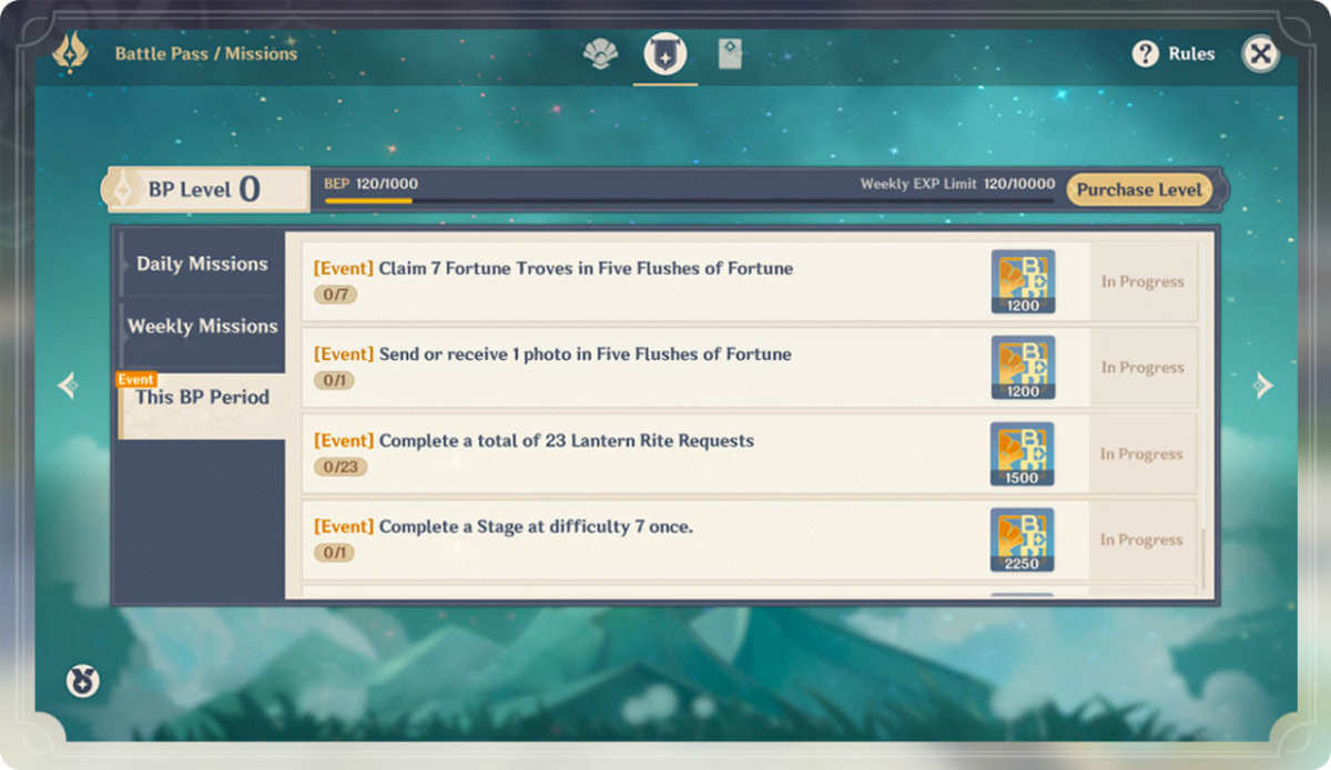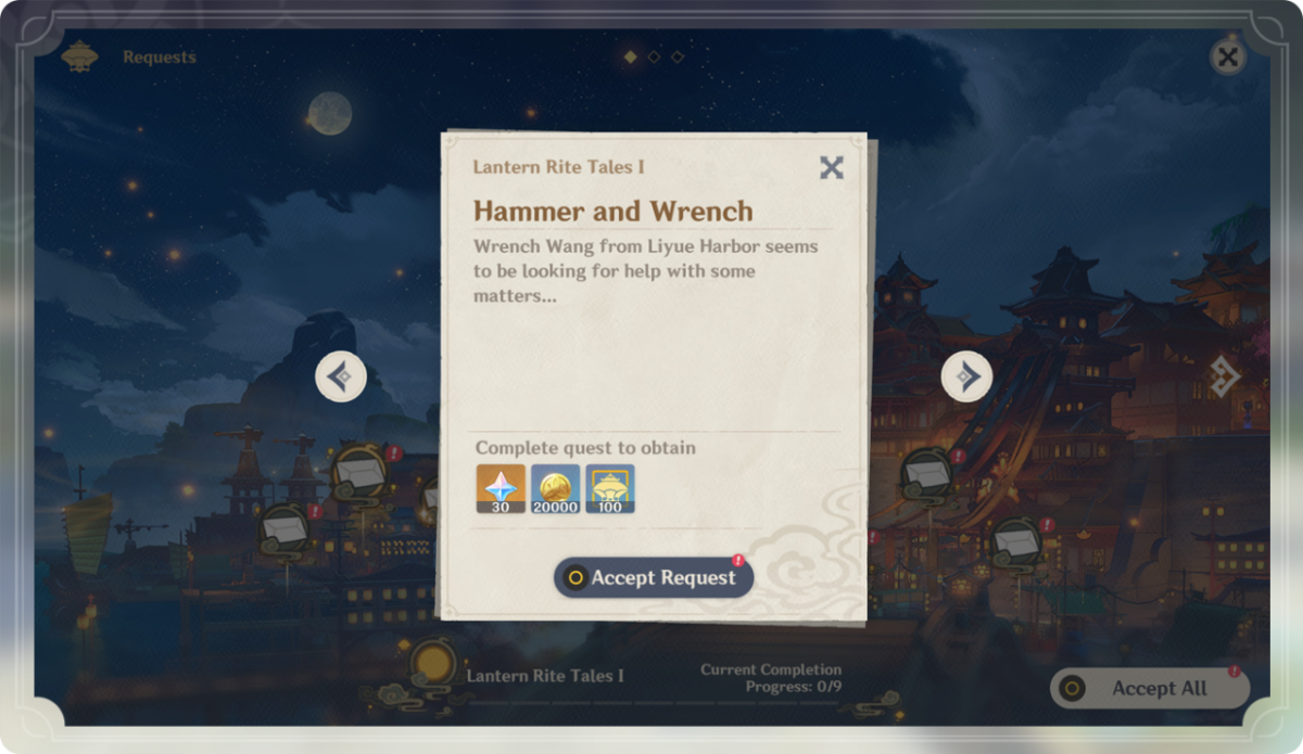 Dopo aver completato ” The Origin of the Lanterns “, i viaggiatori sbloccheranno ” Lantern Rite Tales “. I viaggiatori possono accettare richieste dalla cittadinanza in ” Lantern Rite Tales “. Ogni richiesta completata sarà ricompensata con Primogem, Mora e Festive Fever.