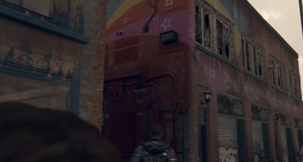 Continua attraverso il tetto e salta il muro oltre lo strapiombo. Una volta che scendi dall’altra parte, controlla l’edificio alto che ha un graffito rosso su di esso. Sembra più una pubblicità che un graffito, può essere facile da trascurare all’inizio proprio per questo motivo.