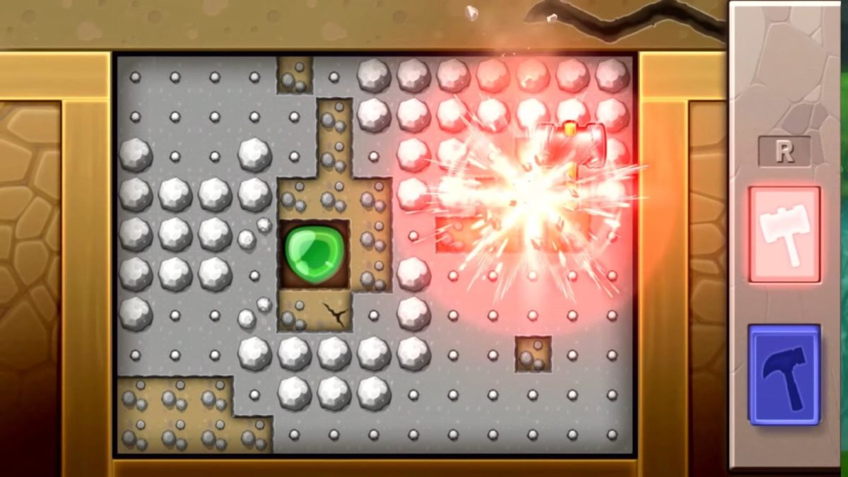 Questa fase richiederà al giocatore abilità e anche un pizzico di fortuna dato che i tesori non saranno visibili, ma saranno nascosti dalla pietra. Per scavare la roccia è possibile utilizzare sia il piccone, il quale scaverà un solo tassello, sia il martello che invece scaverà un’area 3×3. Le mosse saranno limitate e una volta esaurite la parete crollerà.