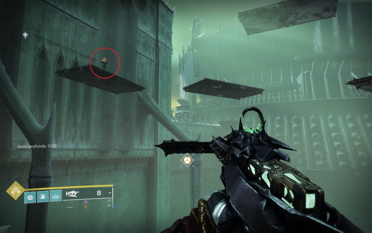 Seguite la strada principale e a un certo punto arriverete a una piazza con una fontana circolare, momento in cui lo Spettro avvierà dei dialoghi per l’impresa. Sconfiggete i nemici presenti per sbloccare un punto per attivare la Visione Profonda. Appariranno alcune piattaforme intorno a voi e ci saranno tre torce da accendere sparandogli. Una volta accese, sulla piattaforma più alta apparirà una cassa contenente la runa.