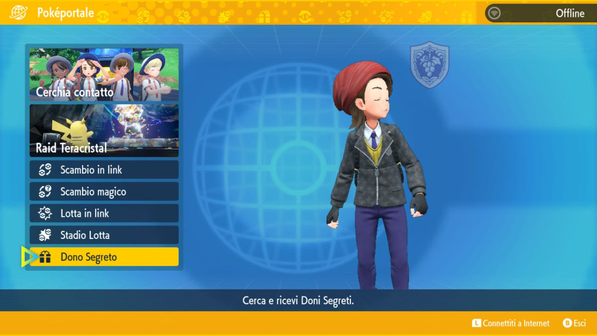 Prima di poter avere accesso al Dono Segreto di Pokémon Scarlatto e Violetto, è necessario essere arrivati alla città di Dosilla, dove Nemi, personaggio che incontreremo nelle prime fasi di gioco, ci porterà verso il Centro Pokémon della piccola cittadina per esigenze di trama. Qui avremo finalmente modo di aprire il Poképortale, un menù che abilita le funzioni online di Pokémon Scarlatto e Violetto.