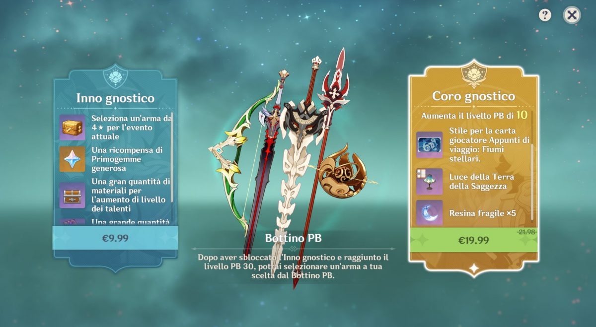 Vi è poi un pass a pagamento che si suddivide in due tipologie, chiamate Inno Gnostico e Coro Gnostico: il primo è acquistabile al prezzo di 10 euro, permette di ottenere ricompense maggiori rispetto al normale Pass Battaglia e una volta raggiunto il livello 30 si potrà scegliere liberamente una delle armi esclusive. L’altro costa invece 21,99€, con ulteriori benefici e l’acquisto di 10 livelli di Pass inclusi: per tutte le delucidazioni su quale conviene comprare e sul loro esatto contenuto consultate la nostra specifica guida agli acquisti!