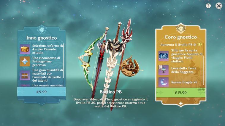 È possibile anche, in maniera del tutto libera, comprare dei Pass Battaglia a pagamento con i quali ottenere più ricompense rispetto alla versione gratuita dello stesso cliccando su Sblocco Inno Gnostico dove potrete scegliere tra questo e il Coro Gnostico: il primo è acquistabile al prezzo di 10€, permette di ottenere ricompense maggiori rispetto al normale Pass Battaglia e una volta raggiunto il livello 30 si potrà scegliere liberamente una delle armi esclusive. L’altro costa invece 21,99€, con ulteriori benefici e l’acquisto di 10 livelli di Pass inclusi. Anche qui sta a voi decidere se comprarlo o meno, anche perché già solo quello base permette di ricevere delle ricompense di tutto rispetto. Per informazioni maggiori su questi due elementi, vi rimandiamo alla nostra guida agli acquisti di Genshin Impact.