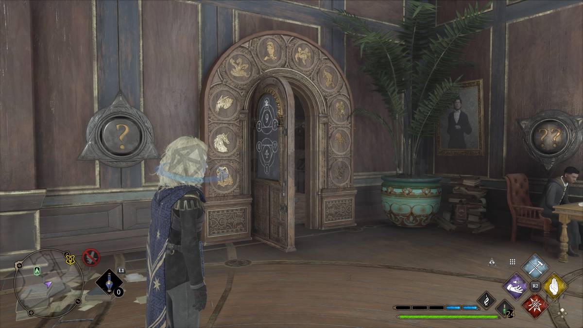 Per questa vi servirà aver seguito la missione “Il Custode dalla Luna Storta” (volendo potete anche sbloccare la porta durante la missione stessa). Viaggiate con la metropolvere fino a “Torre del Corpo Docente”, sezione “Ala Sud”, proseguite dritti poi aprite la porta a destra per accedere all’ala dei docenti. Salite al piano superiore per vedere la porta aritmantica di fronte a voi. La soluzione è Demiguise e Idra.
