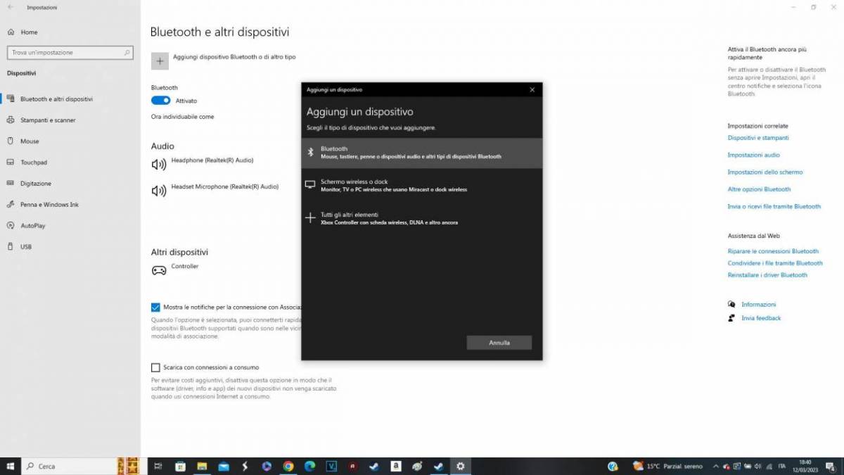 - Dal computer, restando nella schermata Bluetooth e altri dispositivi, selezionate Aggiungi dispositivo Bluetooth o di altro tipo > Bluetooth. Nell’elenco di dispositivi validi per essere associati, scegliete Pro Controller.