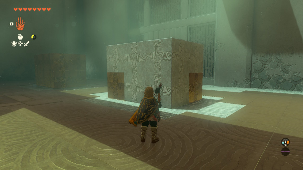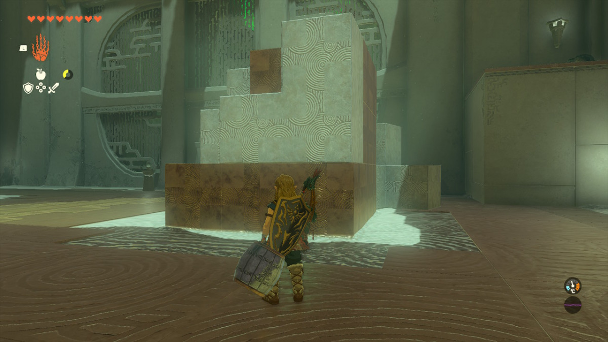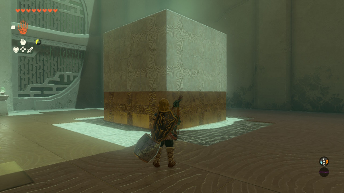 Nella zona chiamata Foresta di Hyrule. Usate il dispositivo con il cubo e poi salite sul cubo ed usate Reverto. Salite sul cubo in acqua ed usate Reverto sul cubo. Prendete il cubo da destra con l’Ultramano, spostatelo sul dispositivo centrale e poi usate il pulsante sopra le scalette. Salite infine sul cubo, usate Reverto su di esso e una volta in alto planate verso l’uscita.