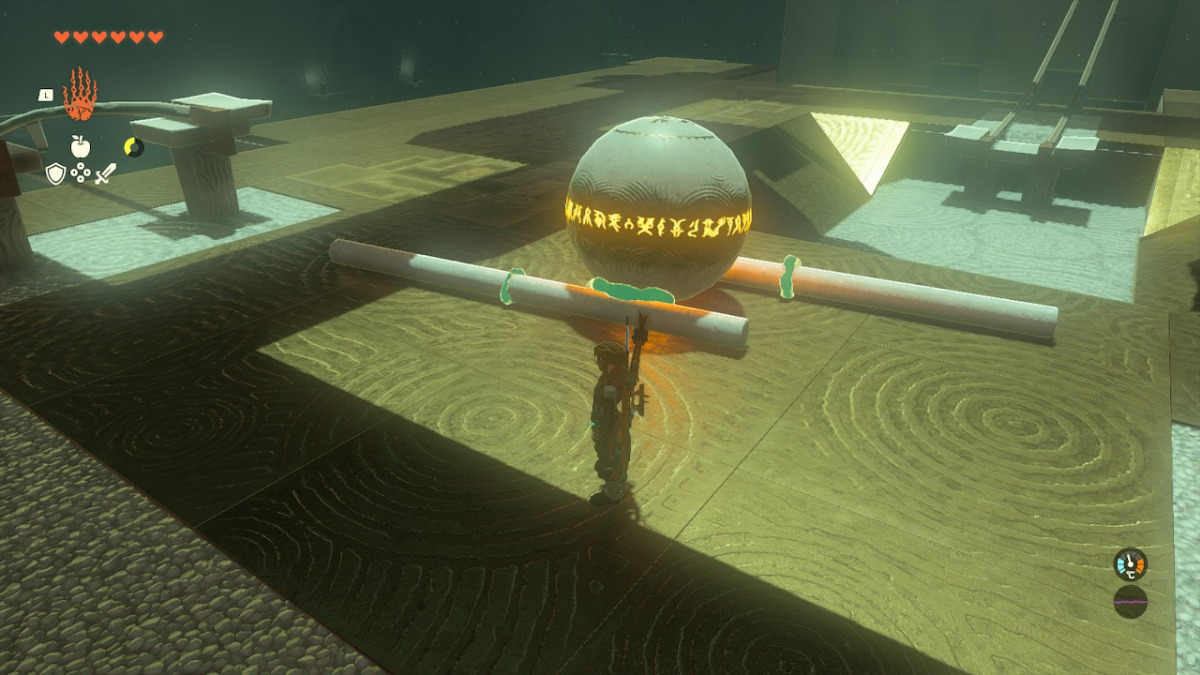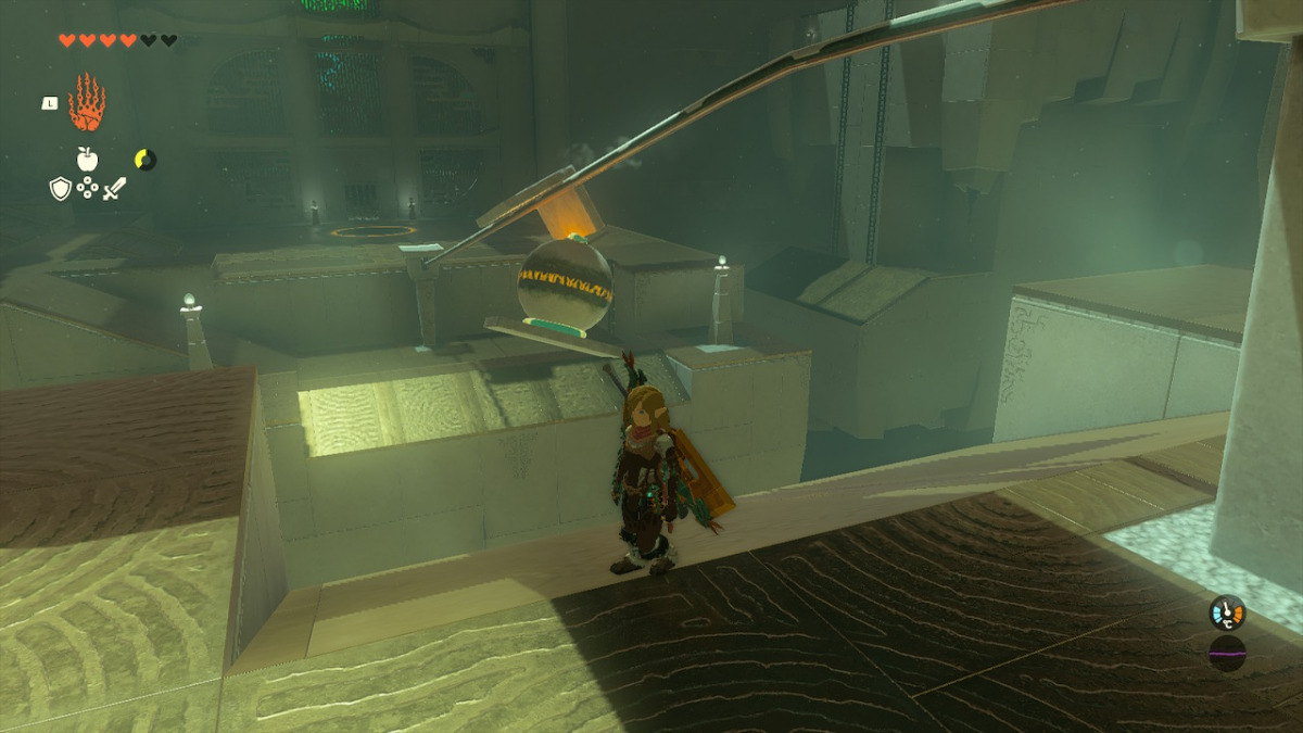 In questo modo potrete metterla, senza paura che cada, sotto lo scrigno di sinistra che contiene una Piccola Chiave. Usata per proseguire vi ritroverete in una stanza con una sfera che penzola sul vuoto a destra. Usate l’Ultramano per spingerla indietro e poi lasciarla oscillare. Ora tagliate la corda con una freccia quando la sfera oscilla verso di voi. Mettetela nell’incavo per uscire.