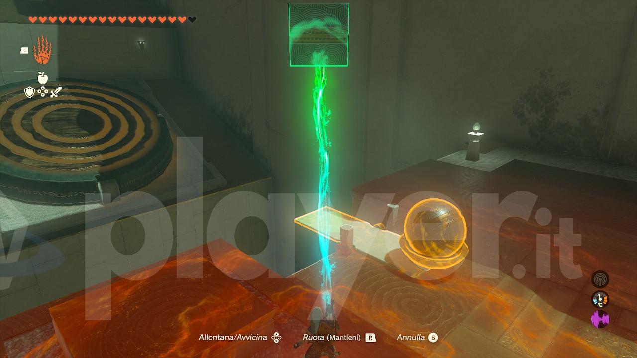Questo sacrario sblocca la sfida “Il sacrario di Hyrule Sud”. Per accedere al sacrario infatti dovete prendere la pietra posizionata nel punto mostrato in foto e portarla nel punto indicato. C’è un dispositivo tra i due punti, create un ponte con quello usando l’Ultramano.