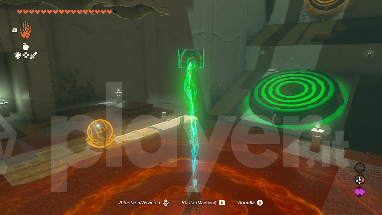 Usate Ascensus per salire. Poi colpite il congegno zonau attaccato alla piattaforma per farla alzare. Ora usate Ascensus e salite sul pezzo di piattaforma alzato dal congegno per planare oltre il vuoto. Qui dovete semplicemente prendere l’ennesimo pezzo di piattaforma con attaccato il congegno ed alzarlo vicino al muro di sinistra. Usate Ascensus per salire anche su questa piattaforma e dall’altra parte create una catapulta per la sfera, con la piattaforma con la mezzasfera, e poi colpite il congegno per farla alzare e sparare la sfera dall’altra parte. Ora usate Ascensus per uscire e tornare al centro e mettere la sfera nell’incavo a terra, si aprirá così la zona di destra. Prendete l’altro pezzo di piattaforma in questa nuova zona, montatelo a quello che avete usato per raggiungere la sfera e spostelo verso l’uscita del sacrario. Saliteci sopra per usarlo come catapulta umana e raggiungere l’uscita. Potete anche usare una freccia per colpire il dispositivo Zonau farlo alzare.