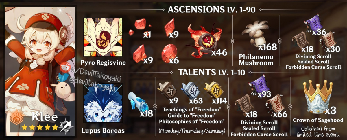 Per portare Klee al livello 90 dovrete superare tutte le fasi di ascensione che vi richiederanno i seguenti materiali totali: