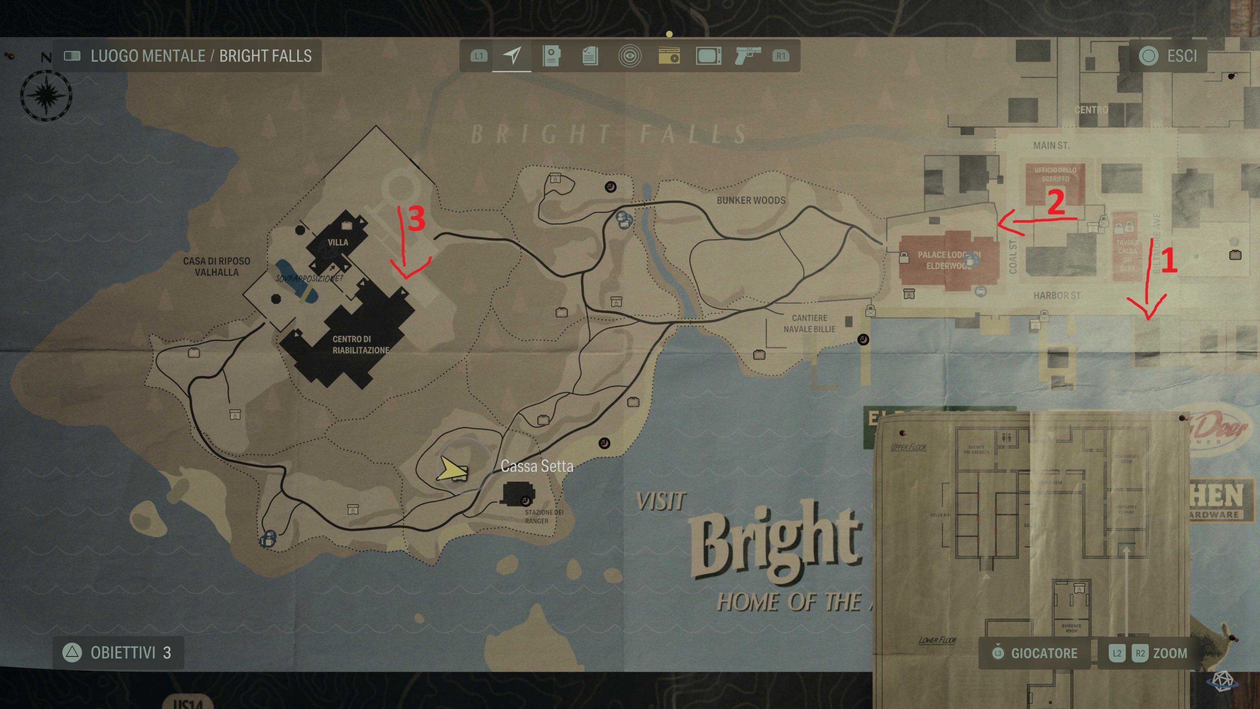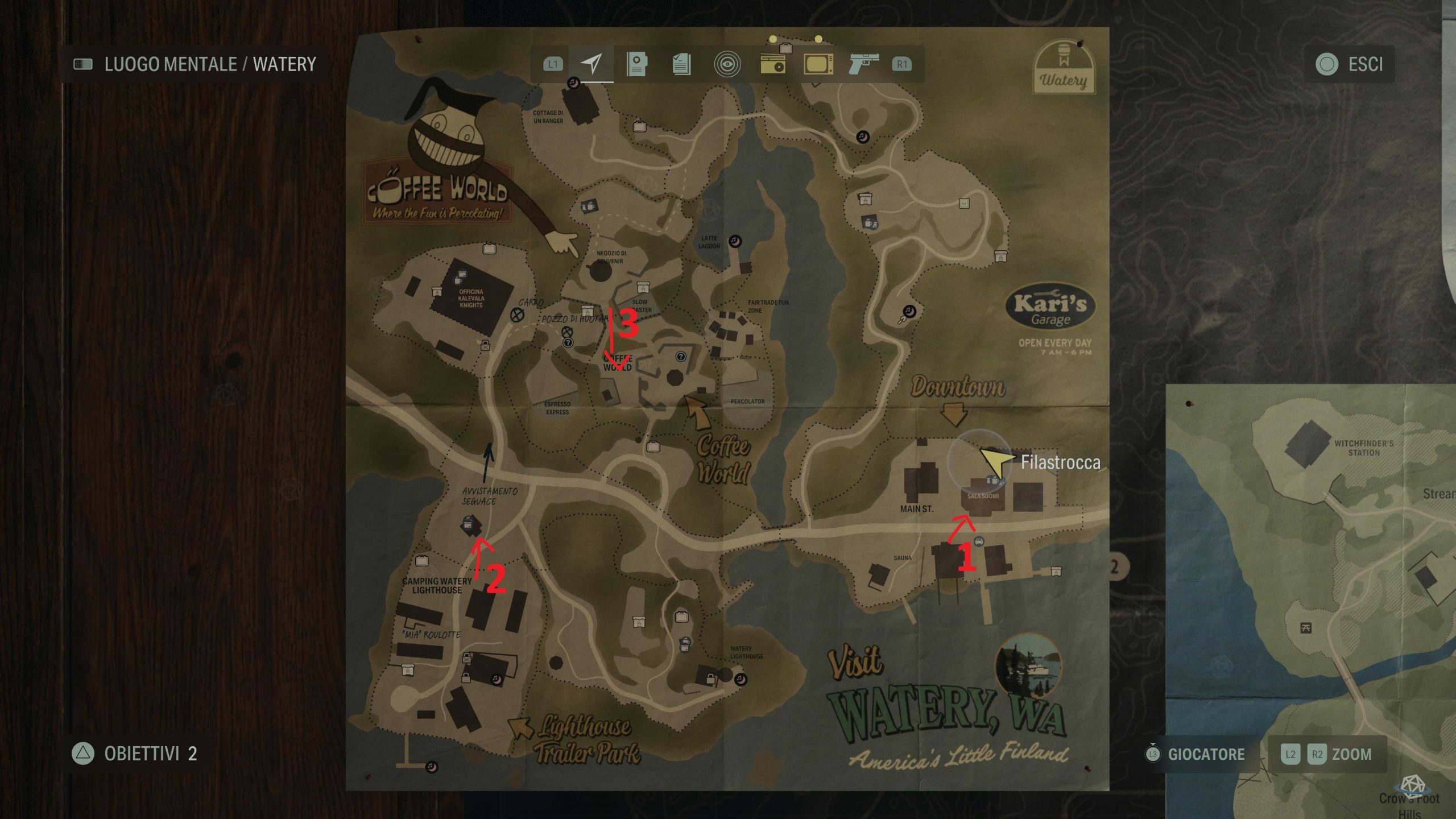 Come già anticipato, per trovare il sindaco Setter dovrete prima interagire con tutti gli slogan promozionali della campagna del sindaco, sparsi nelle città di Watery e Bright Falls. Ogni cartellone con cui interagirete verrà aggiunto al luogo mentale di Saga, nella bacheca tra la radio e i libri di potenziamento armi. Di seguito le posizioni di tutti e 6 gli slogan: