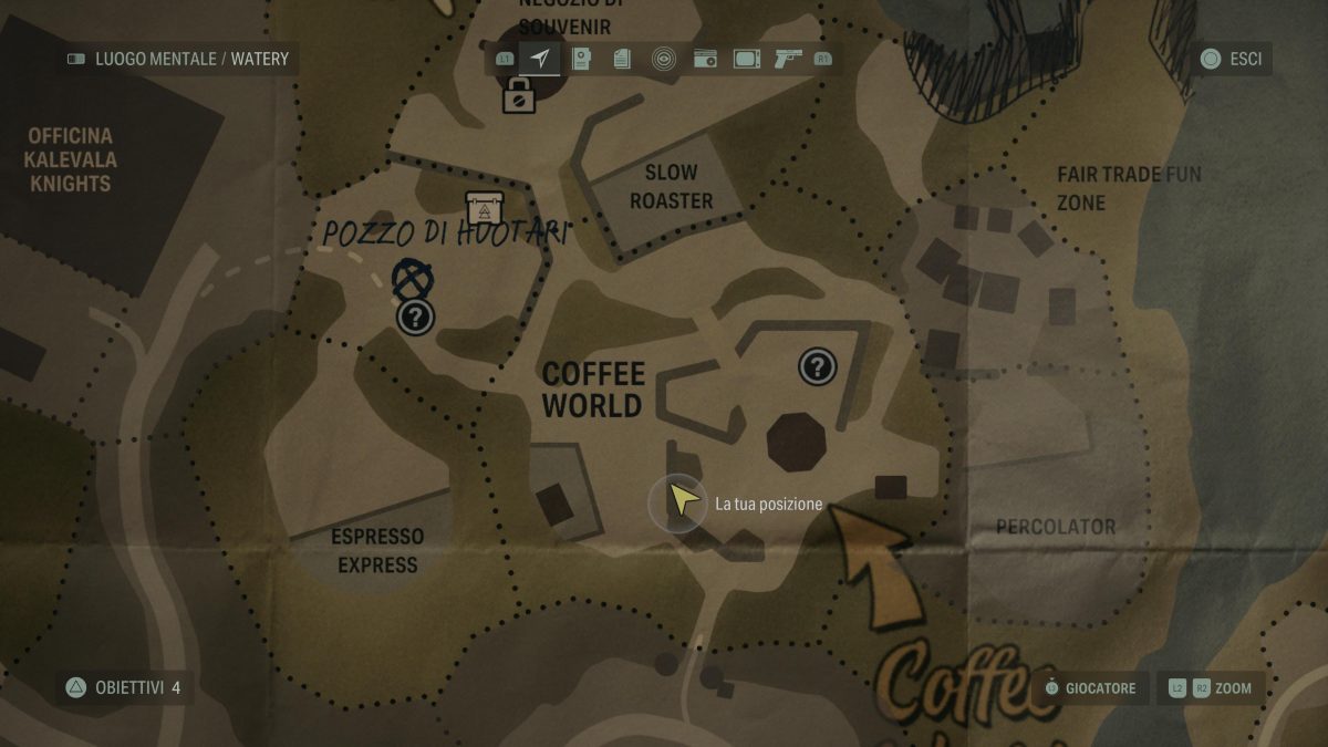 A Coffee World, sotto la ruota panoramica chiamata Slow Roaster, a sinistra. Per aprirla dovrete inserire una serie di numeri che trovate sulle cabine della ruota panoramica. A noi ha chiesto di mettere “solo le tazze a strisce”, l’ordine è antiorario. Quindi il nostro codice era: 147.