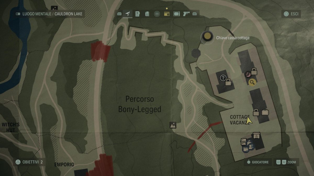 Nel cottage vacanze, servono le tronchesi per entrare. La cassa è nella casa più a sud, quella con la zona relax, nel bagno. Mentre la chiave si trova all’estremo nord, nel punto mostrato in foto, dietro un albero in mezzo alla vegetazione.