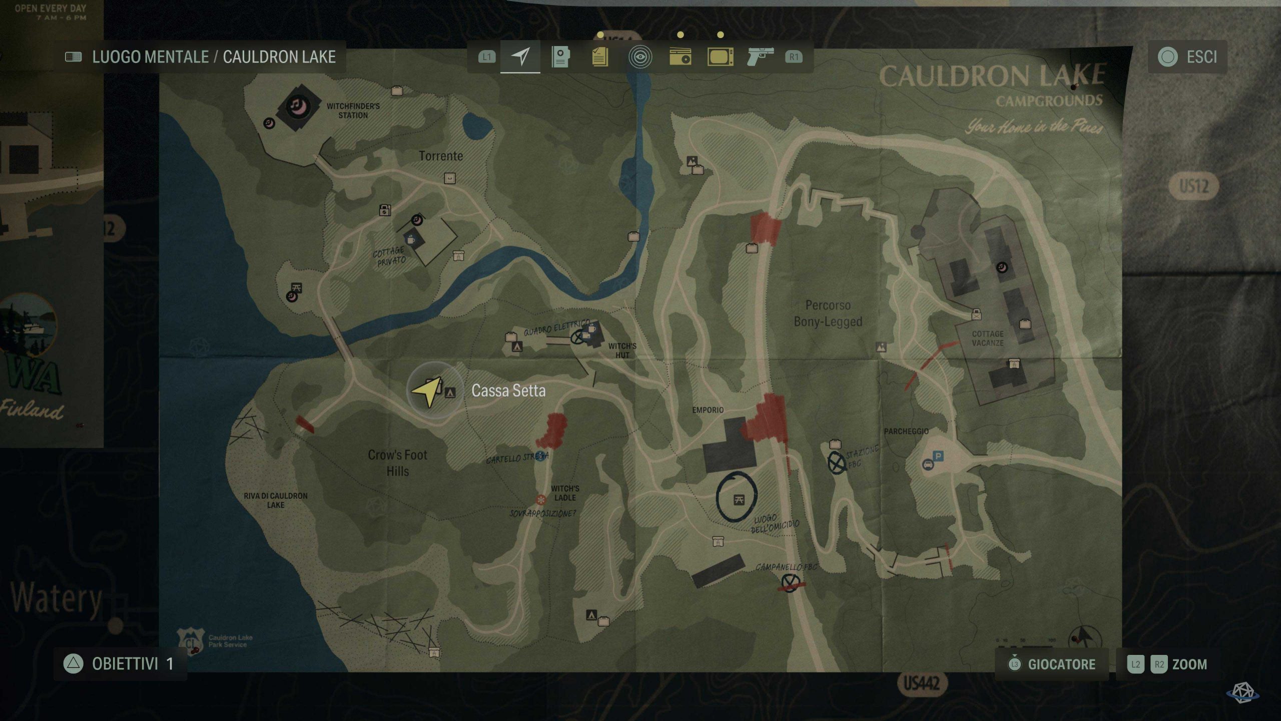 Nel piccolo lembo di mappa alla sinistra del luogo dell’omicidio, dove c’è il punto per mettere la tenda. Alla sinistra delle tende.