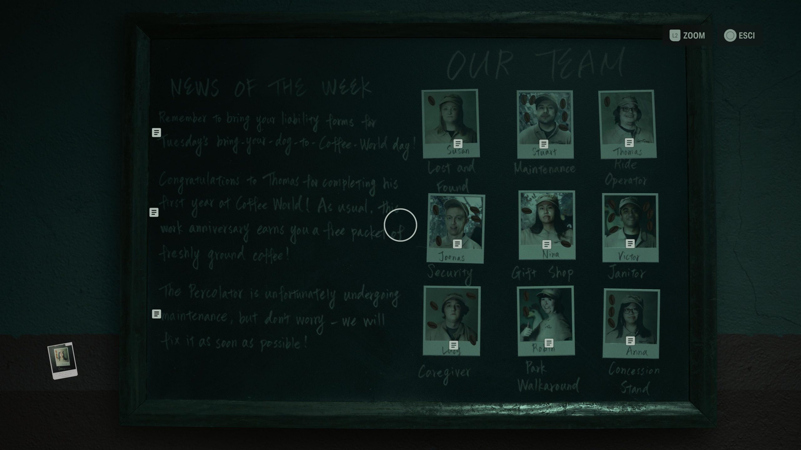 Questo però non basta perché avrete bisogno di numeri specifici da inserire nel tastierino numerico della cassaforte. Se avete fatto i giusti collegamenti sulla lavagna di Saga scoprirete che gli anni di servizio dei dipendenti di Coffee World sono stati segnati su ogni foto con degli adesivi a forma di chicco di caffè. Vi basterà quindi contare quelli sul segugio, sulla vedetta e sul pulitore per capire che il codice è: 1-4-6.