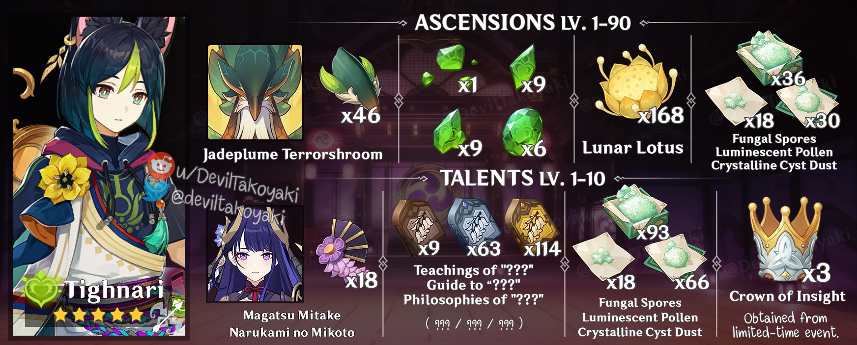 Per portare Tighnari al livello 90 dovrete superare tutte le fasi di ascensione che vi richiederanno i seguenti materiali totali: