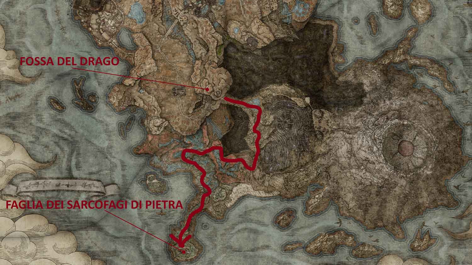 Una volta fuori dal dungeon raggiungete lo spiazzo con il grande drago e andate a destra. Raggiunto il gigantesco drago caduto continuate a scendere verso sud raggiungendo il luogo mostrato in mappa.