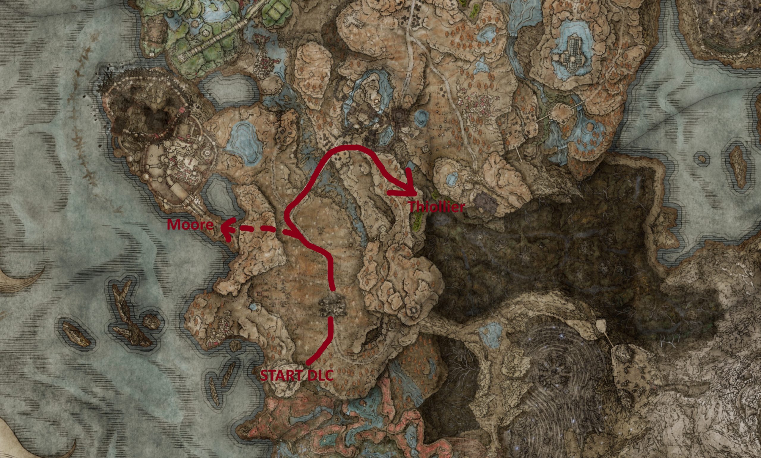 Se avete incontrato Thiollier, sconfitto il Leone Danzante, Rellana e raggiunto la Rocca delle Ombre per rompere la Runa Sigillo di Miquella, potrete parlare con Moore il mercante al sito di grazia Croce del Cancello Principale (percorso tratteggiato nella mappa precedente).