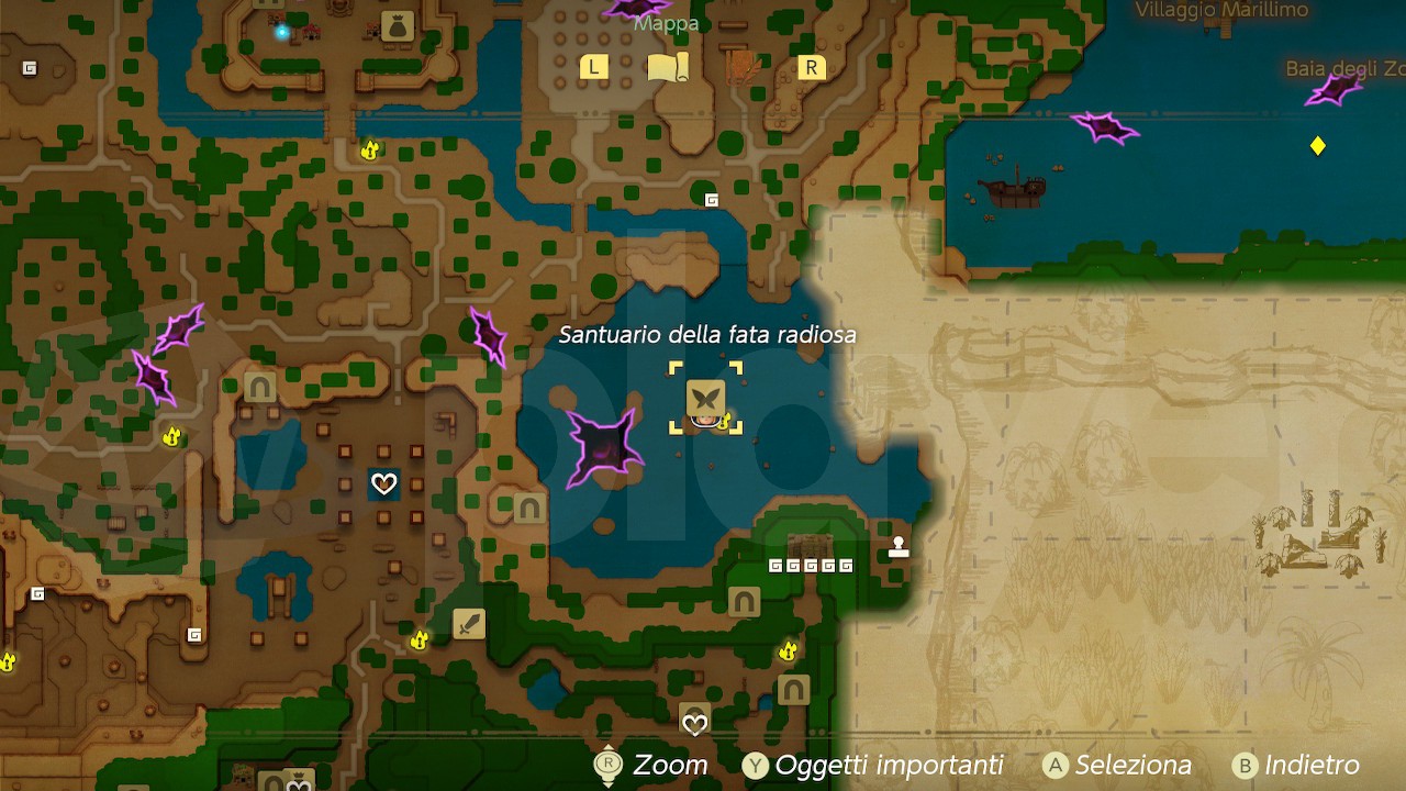 Parlando con gli abitanti scoprirete che questo è il villaggio dello scomparso Link (e infatti potrete anche visitare la sua casa in alto a sinistra). Qui c’è poco da fare ma l’importante è comprare il Frammento di cuore nel negozio.