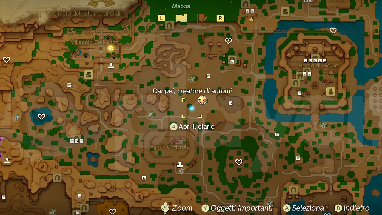 Leggete il diario di Danpei per sbloccare la missione. Dovrete mostrargli uno Zol (quello di base va bene) e poi parlare con Danpei per mostrargli il Carillon Iridato vinto nelle corse al ranch di Hyrule. Se volete saperne di più consultate la guida sovrastante, capitolo “Ritorno nella Piana di Hyrule”.