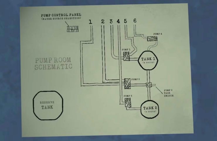 Associando il disegno riportato sul manuale al pannello di controllo della sala delle pompe è possibile controllare le varie fonti d’acqua presenti all’interno della villa di Blue Prince e regolarle di conseguenza: ogni numero corrisponde a una precisa fonte d’acqua che è possibile riempirla o svuotarla a piacimento.