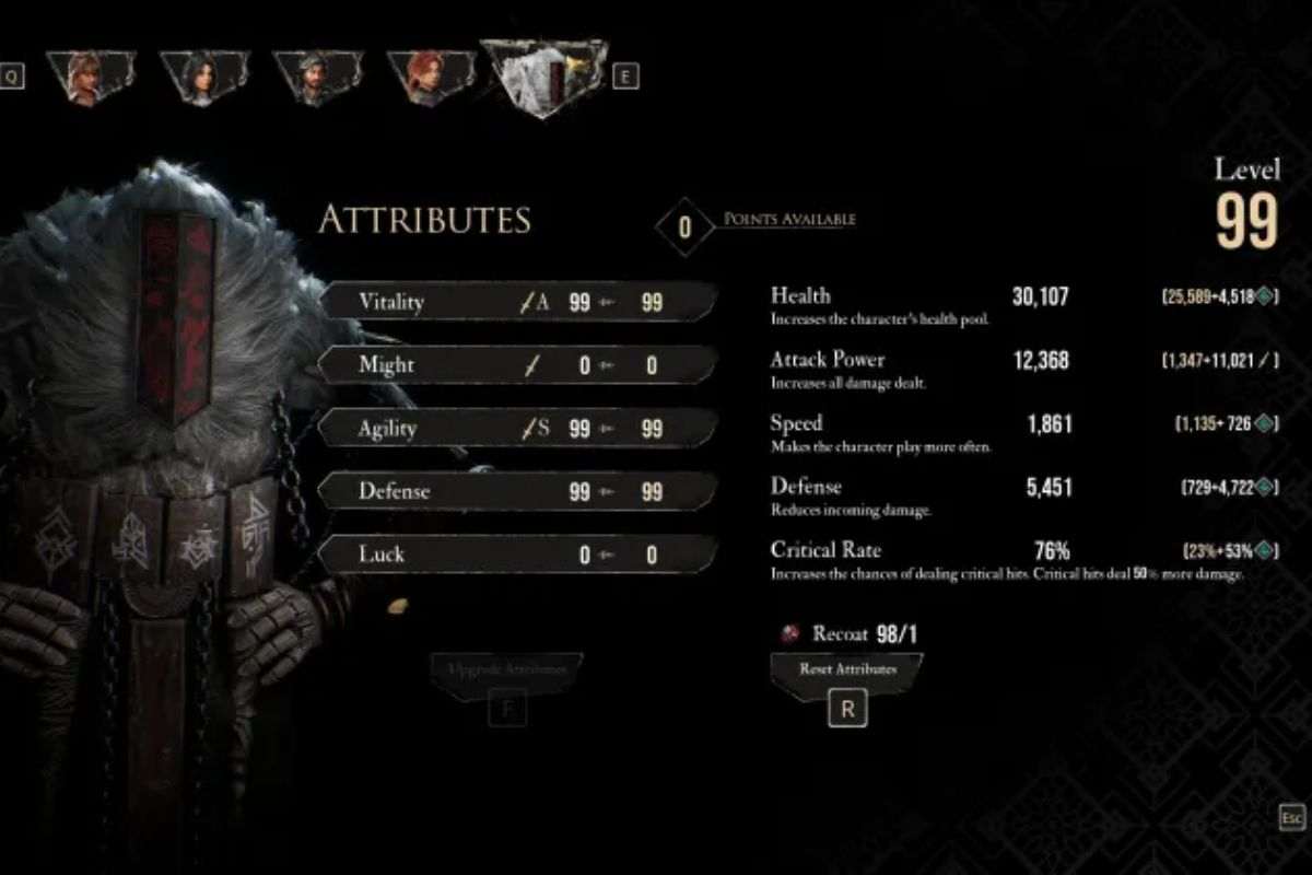 Come abbiamo già visto per le altre guide, la distribuzione degli attributi dipende molto dall’arma equipaggiata e non si può prescindere da questo. Come per gli altri personaggi dunque, il consiglio primario è di conservare un po’ di Ritocchi per la fine del gioco, così da avere sempre la possibilità di adattare gli attributi alle nuove armi e alla nuova build.