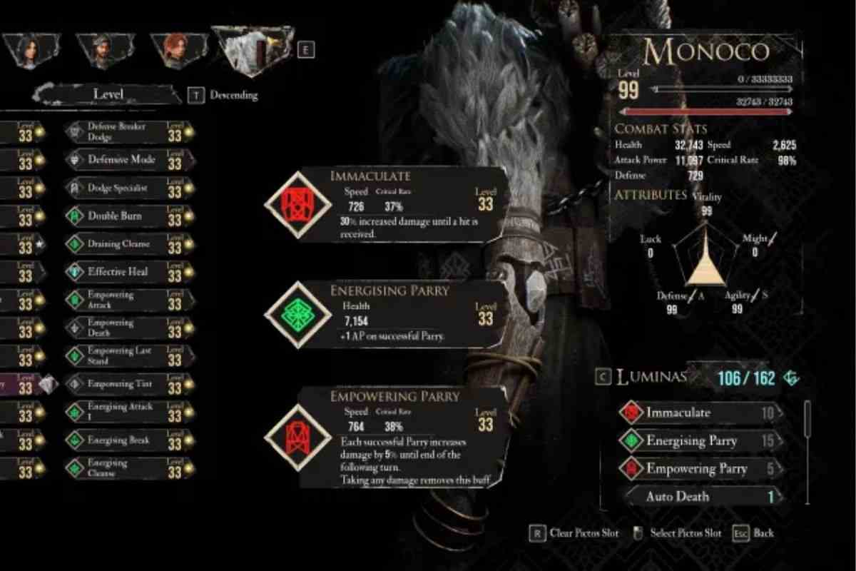 Come potrete notare, oltre a quelli perfetti per chiunque, ve ne sono anche un paio che puntano in una direzione ben specifica: riuscire a fare più danni possibili, mentre si mantiene la salute molto bassa. A questi potreste associare dei Picto o Lumina che vi conferiscono degli scudi, all’inizio o durante la battaglia… giusto per essere più sicuri.