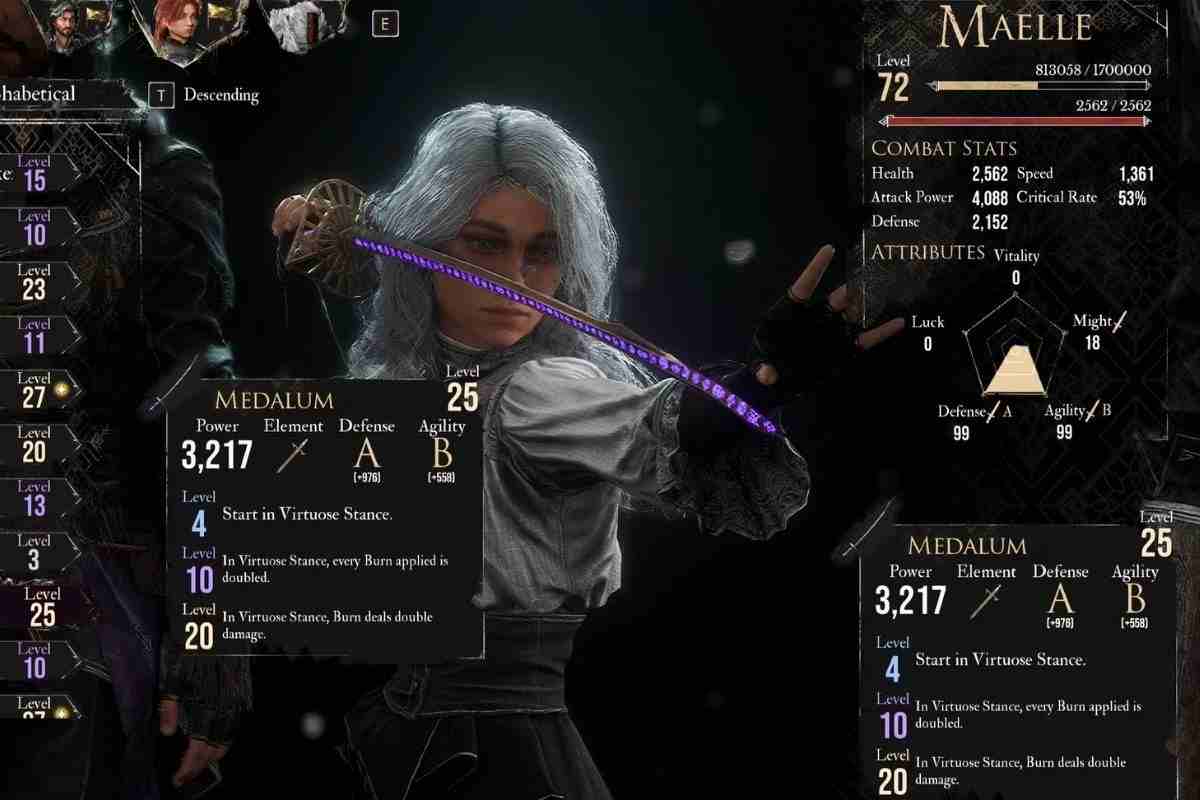 Se siete dubbiosi sul perché la Medalum sia la scelta più giusta, è presto detto: la particolarità del combat system di Maelle, è quella di cambiare “Posa”, tra Difensiva, Offensiva e Virtuosa. Quando si devono fare più danni possibili con un singolo colpo, bisogna essere in posa Virtuosa, dato che in questa istanza, Maelle aumenta i danni inflitti del 200%.