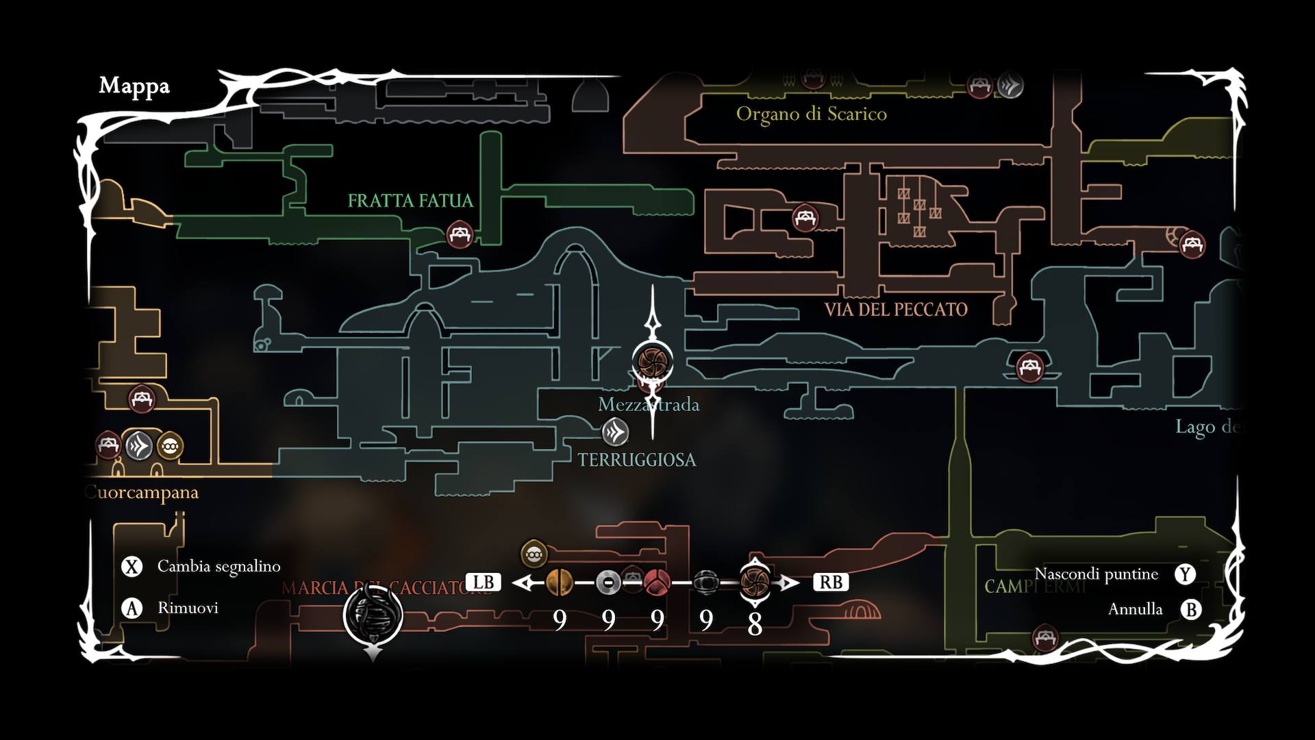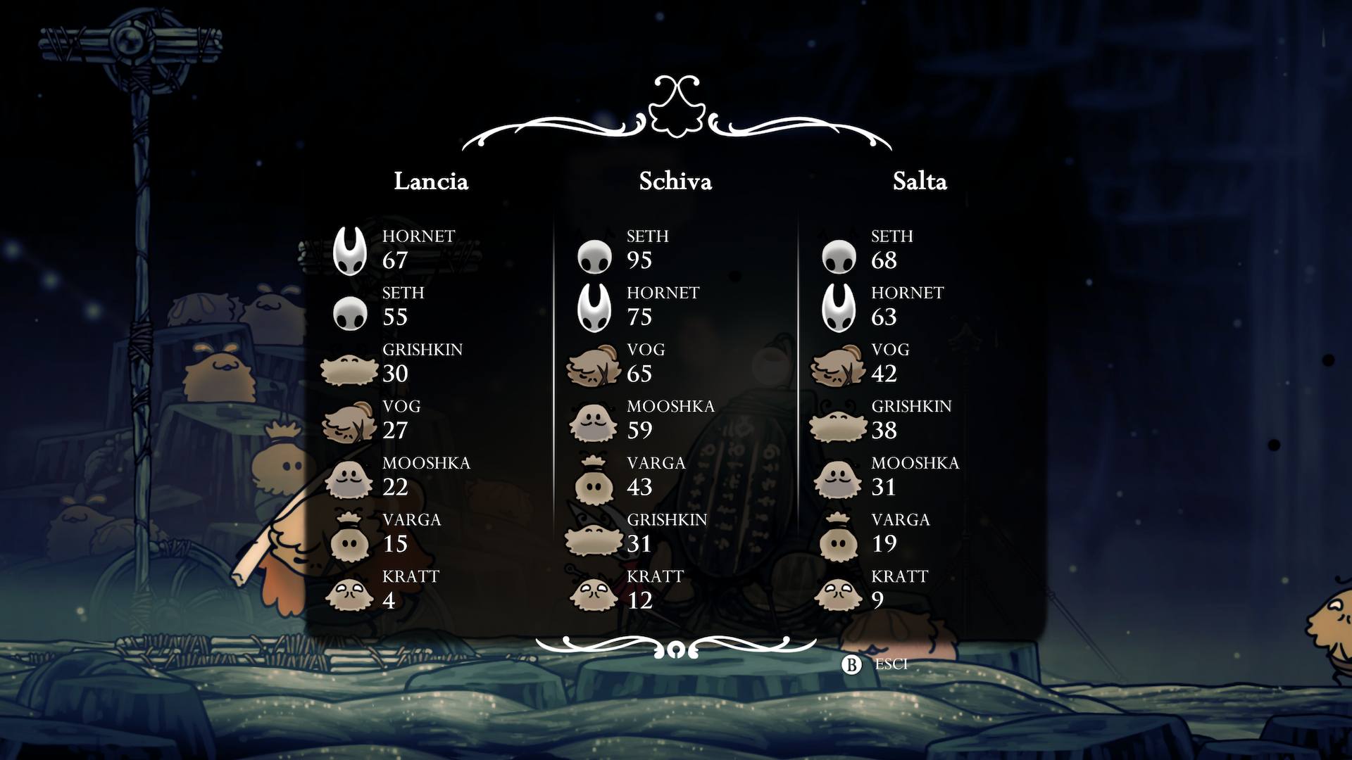 Similmente al Marchio del Cacciatore del primo Hollow Knight, anche in Silksong c’è la possibilità di ricevere un premio una volta completato il Diario delle Bestie di Lungitela: è il Cimelio della Cacciatrice, donato da Nuu a Mezzastrada una volta completate tutte le voci (sia quelle generiche che le note di Hornet) di tutti i nemici presenti nel gioco.