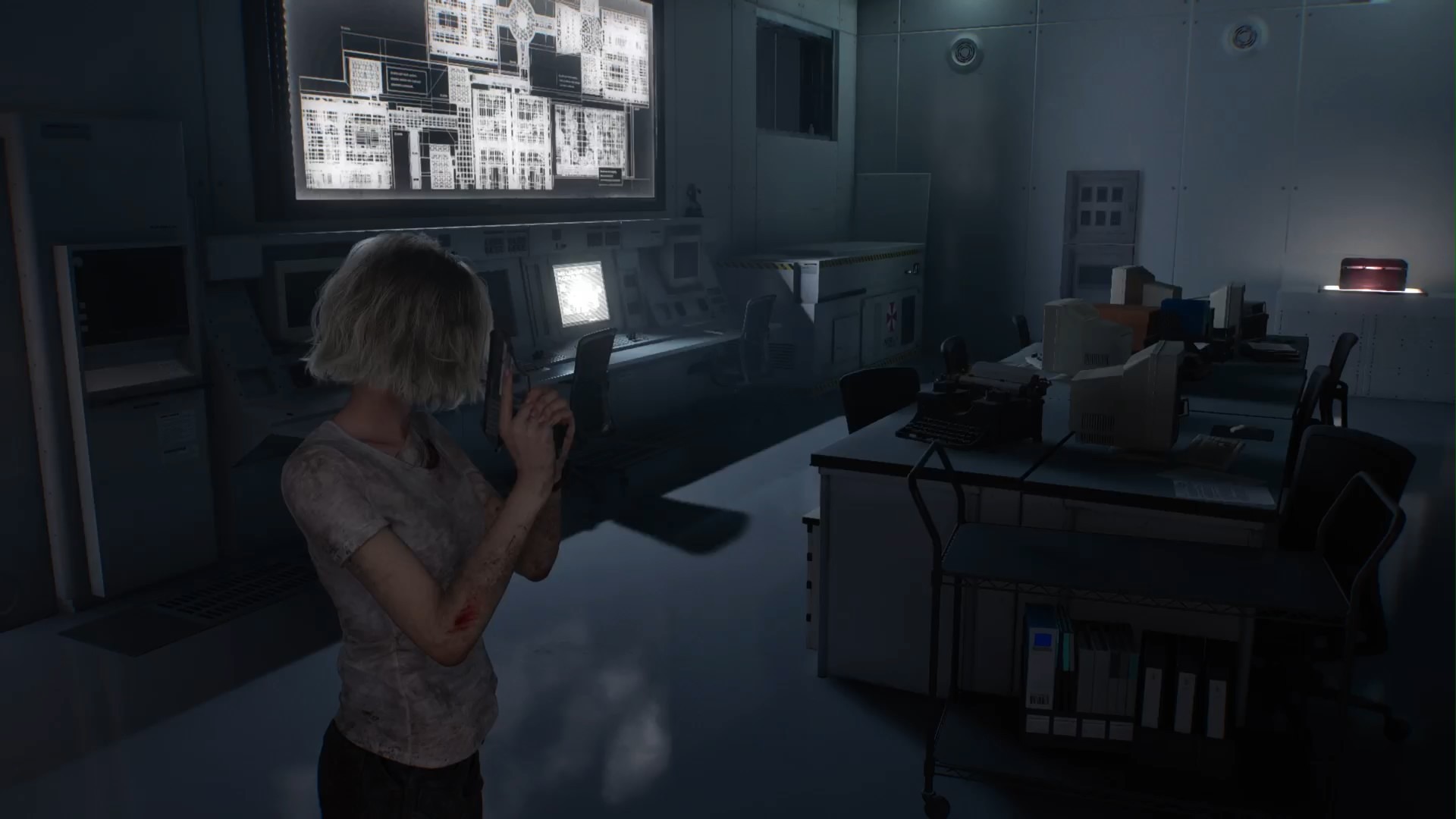 Salite le scale di fronte all’Ufficio del Custode, all’ultimo piano rompete le casse e prendete MUNIZIONI e SCARTI. Al primo piano invece entrate nell’Archivio per trovare altre MUNIZIONI, un AUTOINIETTORE VUOTO su uno scaffale il DOCUMENTO – Rapporto della squadra di smaltimento e un COLTELLO DI FORTUNA nell’armadietto.