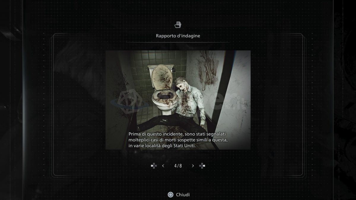 Questo passaggio è mostrato con un indizio, anche questo molto fumoso, nel dossier del caso che avete all’inizio nell’inventario. Se guardate c’è un 8 scritto col sangue sulla parete di destra in un bagno.