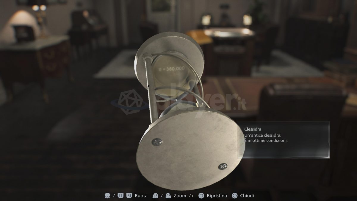 Sempre con Grace A Rhodes Hill, nella stanza ascensore di fronte all’eliporto, potrete raccogliere una CLESSIDRA dalla scrivania svitando le viti laterali. Questo oggetto, che sembra inserito solo per distrarre il giocatore da quello vero, la bottiglia, che serve a proseguire, ha in realtà una valenza fondamentale per l’Enigma Finale.