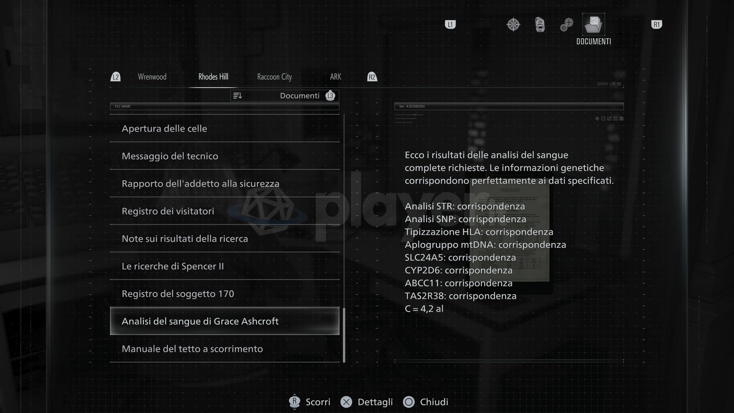 Nei pressi del Laboratorio Privato, sotto Rhodes Hill, dove prendete le chiavi dell’elicottero, potete trovare anche il DOCUMENTO – ANALISI DEL SANGUE DI GRACE ASHCROFT. Queste, nonostante abbiamo sigle strane, corrispondono tutte a particolari test genetici. Tutte tranne l’ultima riga che recita: