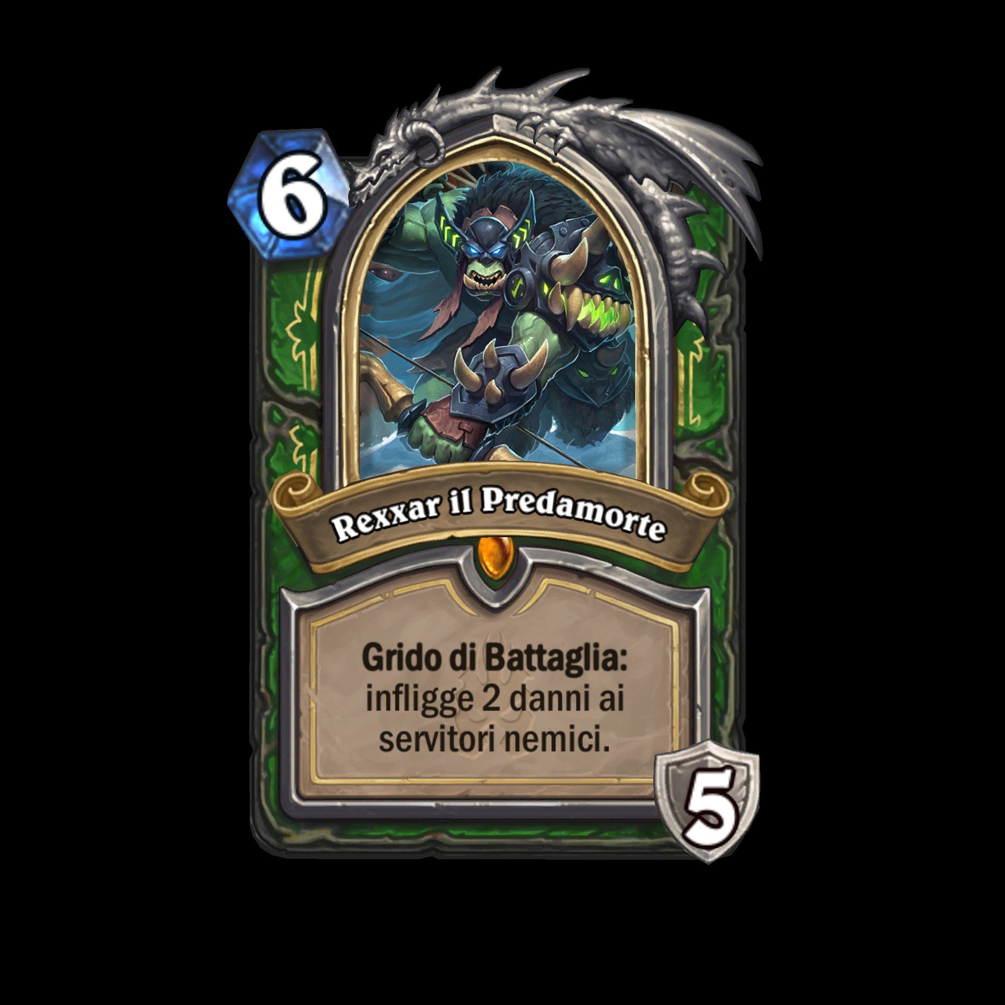 Dopo che la caccia di Rexxar terminò prematuramente, venne resuscitato come Rexxar il Predamorte. Quando viene giocato, scaglia una salva di frecce infliggendo 2 danni ai servitori nemici, sostituisce il vostro eroe fornendo 5 Armatura e cambia il Potere Eroe in Genesi Bestiale.