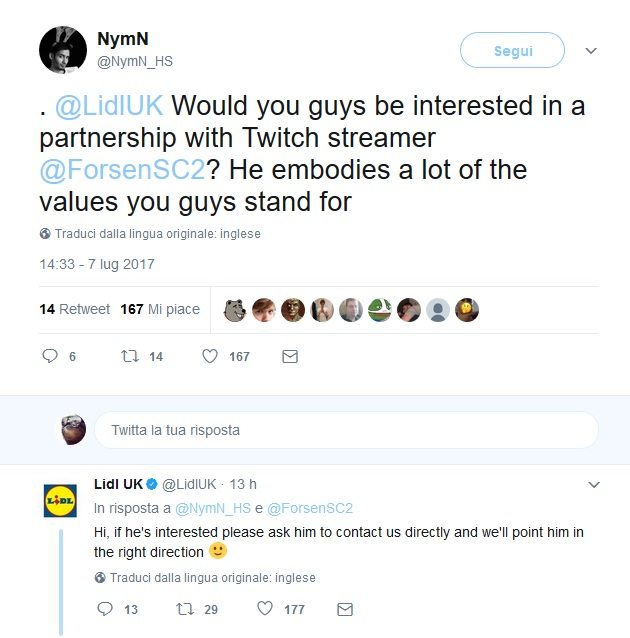 Ciò ci porta alllo scorso 7 luglio quando su Twitter, un altro streamer chiamato NymN ha scherzosamente chiesto alla Lidl se fossero interessati ad una collaborazione con uno streamer di Twitch visto che lui rappresenta al meglio i valori dell’azienda.