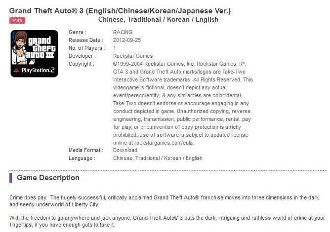 Come possiamo vedere dall’immagine, presa dal sito ufficiale PlayStation Honk Hong (le cui date coincidono molto spesso con il mercato Europeo), GTA 3 sarà disponibile dal 25 Settembre in modalità digital download.