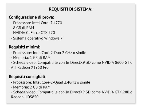 DeadCore sfrutta il motore grafico Unity e all’avvio predispone una configurazione ottimale per l’hardware che tuttavia è possibile modificare solo in termini di qualità generale e risoluzione. Di seguito trovate la nostra configurazione di prova, i requisiti minimi e quelli consigliati. Sfortunatamente il gioco non disponde della lingua italia. DeadCore è disponibile per PC, Linux e Mac.