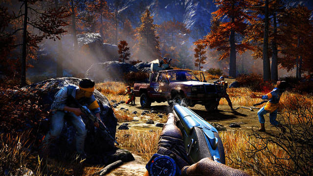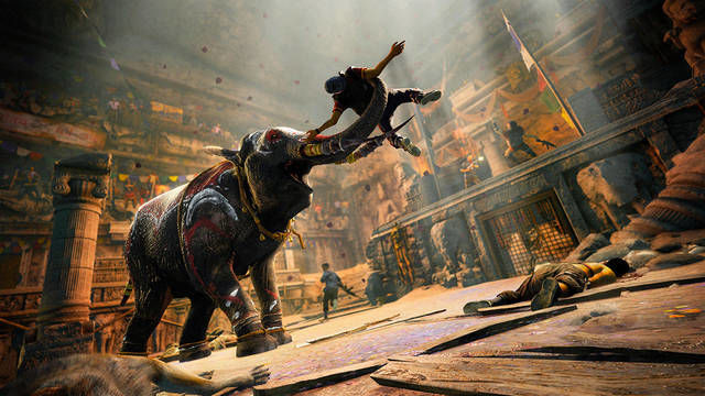 Ajay Ghale, originario del Kyrat è un tranquillo cittadino americano. Il suo unico scopo tornando nella terra dei suoi cari è quello di esaudire l’ultimo desiderio della madre da poco defunta. Giunto fra le splendide montagne della regione munito dell’urna cineraria tuttavia, egli inizia a comprendere gli intricati rapporti politico-sociali ed economici che governano il Kyrat e scopre dalle stesse parole del viscido dittatore Pagan Min di non conoscere a fondo il passato della madre. Il pretesto che dà avvio alla catena di eventi successivi è piuttosto semplice ed efficace, tuttavia si percepisce una minore caratterizzazione del protagonista che in maniera piuttosto passiva assiste ad alcune delle più comuni pratiche di terrorismo messe in atto da Pagan Min. La presenza del nemico principale viene inoltre fatta passare un po’ in sordina per incentrare la storia, e di conseguenza anche la maggior parte delle missioni principali, sulla lotta interna tra le due fazioni del Sentiero d’Oro, la comunità creata dagli abitanti del Kyrat per contrastare la feroce dittatura di Pagan. Le importanti scelte morali a cui verremo sottoposti riguardano proprio le differenti ideologie dei due gruppi, uno maggiormente legato alla tradizione mistica della regione, l’altro più aperto all’idea di una vera e propria rivoluzione. Questa dualità non si riflette in una separazione netta tra bene e male, poiché nel corso della narrazione le scelte iniziali vengono continuamente messe in discussione dalle argomentazioni della fazione interna opposta, e tutto ciò si riflette naturalmente in un livello di profondità decisamente apprezzabile. Le scelte inoltre influenzano lo svolgersi degli eventi e condurranno ad uno degli otto diversi finali previsti. La narrazione purtroppo non osa mai proponendo situazioni davvero al limite o sequenze particolarmente spettacolari. A valorizzare l’esperienza della campagna ci pensa però la splendida ambientazione, ora più ricca di elementi e articolata verticalmente rispetto a quella dell’isola e di conseguenza anche più difficile da tenere d’occhio durante i combattimenti.