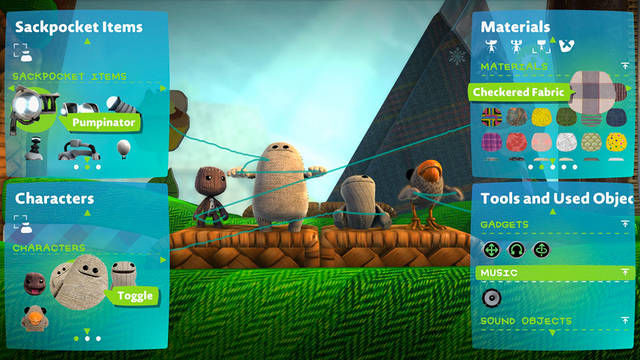 La prima novità proposta dal titolo consiste nella struttura dei mondi dell’Imagisfera che potremo esplorare nel corso dell’avventura. I livelli non sono più collegati fra loro in uno schema di avanzamento lineare, bensì assistiamo all’introduzione di tre hub principali, dove potremo accedere ai diversi livelli della storia e ad un certo numero di attività secondarie legate a personaggi che chiederanno il nostro aiuto in diverse occasioni. I tre hub sono legati ai nuovi personaggi introdotti in questo terzo capitolo: Oddsock, Toggle e Swoop, che sarà nostro compito liberare cercando delle particolari biglie nei livelli indicati. I nuovi alleati di Sackboy hanno rivelato fin da subito il loro grande potenziale e le importanti novità in termini di meccaniche. Oddsock è un cagnolino velocissimo capace di rimbalzare sulle pareti saltando da una direzione all’altra. La sua aggiunta ha permesso di ampliare le possibilità di movimento avvicinando il titolo ai platform più classici come Super Mario o il più recente Rayman, dove il doppio salto e la scivolata sono elementi estremamente funzionali. Toggle è un pupazzetto capace di mutare le proprie dimensioni e diventare più piccolo e leggero. Con il profilo standard Toggle può spostare oggetti pesanti e distruggere elementi fragili ma risulta particolarmente lento. Quando si rimpicciolisce invece può spiccare salti enormi e correre sulla superficie dell’acqua. La combinazione di due personaggi in uno ha permesso agli sviluppatori di creare livelli ad hoc dove il giocatore deve effettuare la trasformazione con un certo tempismo. Infine Swoop è un piccolo uccellino di pezza capace di librarsi in aria, sollevare in volo oggetti, e schivare agilmente gli ostacoli in picchiata. Una volta liberati questi personaggi nei tre hub, potremo continuare l’esplorazione sfruttando le loro abilità per raggiungere parti prima inaccessibili. Purtroppo in queste sequenze non potremo decidere autonomamente chi utilizzare, e saremo costretti dal gioco a cambiare personaggio per proseguire in un certo punto dello stage. L’esplorazione viene ampliata anche dai nuovi gadget, utilizzabili solo dal Sackboy, che vengono gestiti attraverso un menù circolare attivabile premendo il tasto Cerchio del Pad. Questi ultimi vanno sbloccati in maniera lineare nel corso dei livelli, e potranno poi essere utilizzati per raggiungere zone prima inaccessibili. Tra di essi abbiamo ad il Turbinator, che permette di respingere o attirare gli oggetti con due getti d’aria associati ai tasti L1 e R1, il Casco Rotella, con cui Sackboy potrà agganciarsi alle ringhiere metalliche sospese e gli Stivali Propulsori, che permettono di elevare ulteriormente il salto. I gadget si sono rivelati molto divertenti da utilizzare e aggiungono una buona dose di varietà al gameplay anche se il loro utilizzo è sempre mirato a livelli dedicati.