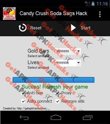 Come potete vedere dalla schermata superiore, con questo tool potrete anche rimuovere la pubblicità del gioco. Potete scaricarlo direttamente dal sito del produttore di Trucchi per Candy Crush Soda.
