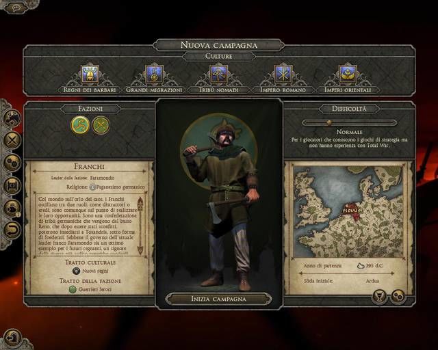 I Franchi: Ben lontani dai pericoli delle invasioni, l’obiettivo principale dei Franchi è staccarsi dall’impero romano. Bisognerà approfittare del momento di difficoltà dei romani e scegliere tra l’invasione verso Sud o quella verso la Britannia a Nord. Gestire i Franchi non sarà semplice, per questo la fazione è consigliata a chi ha già molta esperienza di guerra e ha già giocato ad altri capitoli del franchise perché le meccaniche di gioco sono molto simili.