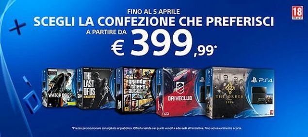 È la prima volta che Sony ci fa scegliere il gioco, di solito piazzava i bundle preformati. Potremo così scegliere tra Watch Dogs, GTA 5, The Last of Us Remastered, DriveClub e The Order 1886. Non tutti i punti vendita aderiranno all’offerta, quindi vi conviene informarvi prima di recarvi dal vostro rivenditore di fiducia, e ricordate che il bundle è valido solo dal 22 marzo prossimo fino al 5 aprile.