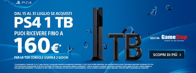 Sony ha annunciato con Gamestop una promozione per l’acquisto della PS4 Ultimate Player 1TB Edition. Acquistando questa versione dal 15 al 31, sarà possibile ricevere fino al 160€ la propria console usata e due giochi.