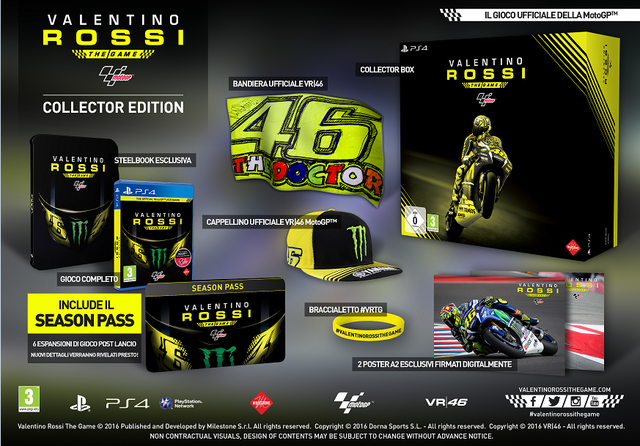Milestone, la più grande realtà italiana impegnata nello sviluppo di videogiochi sul mondo racing, annuncia i contenuti della Collector’s Edition dedicata a Valentino Rossi The Game, versione PS4, previsto in uscita disponibile sugli store digitali e fisici a partire dal prossimo 16 Giugno 2016 per PlayStation 4, Xbox One e Windows PC/STEAM.