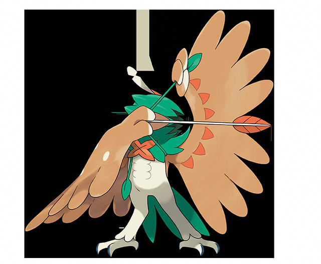 Decidueye fende l’aria scagliando le sue piume come una pioggia di frecce e piomba sul bersaglio per sferrare l’attacco decisivo.