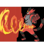 Incineroar balza altissimo in aria e si lancia dritto sul bersaglio emettendo fiamme dalla cintura di fuoco che ha sulla vita.