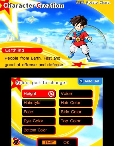 Il gioco introduce due nuovi personaggi: Pinich, il tuo migliore amico e rivale, e il personaggio che avrai creato. Dalla razza (tra cui terrestre, saiyan, alieno, oltraneo, namecciano) al colore degli occhi, dal taglio di capelli alla voce e tanto altro, sta a te creare il nuovo guerriero di Dragon Ball. Una volta che hai deciso, ti troverai a esplorare diversi mondi costituiti da diverse location dell’universo di Dragon Ball.