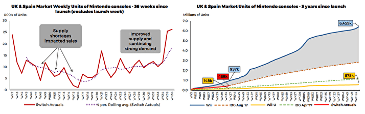 I dati raccolti e diramati dal rivenditore GAME non lasciano spazio all’interpretazione: nel Regno Unito ed in Spagna, ad ogni Switch venduta corrispondono non meno di tre giochi. Ogni possessore della nuova console Nintendo ha comprato almeno tre titoli, ovviamente in formato retail. Questi risultati, secondo GAME, sono perfettamente in linea con le performance di vendita di Nintendo Wii, la seconda console più venduta al mondo. L’unica differenza con Switch consiste nel fatto che, quando Wii fu lanciato sul mercato, il digital delivery non era ancora così diffuso. Nonostante non vengano mostrate le vendite in digital delivery, è possibile constatare che il rapporto tra giochi fisici e console vendute è di 3.6.