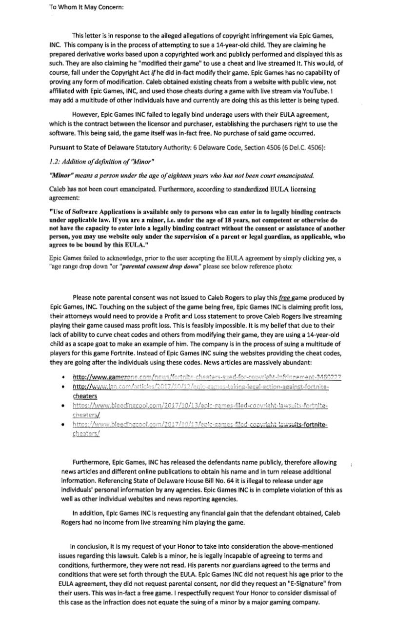 In ultima analisi, come detto anche in precedenza, Caleb ha 14 anni. Il genitore afferma che Epic Games, rivelando pubblicamente il nome del figlio nel momento in cui ha iniziato la causa, avrebbe violato le leggi dello Stato del Delaware, rivelando dei dati personali di un minorenne. È possibile, però, affermare che il publisher non conoscesse l’età del cheater in questione, se non nel momento in cui lo ha chiamato in giudizio.